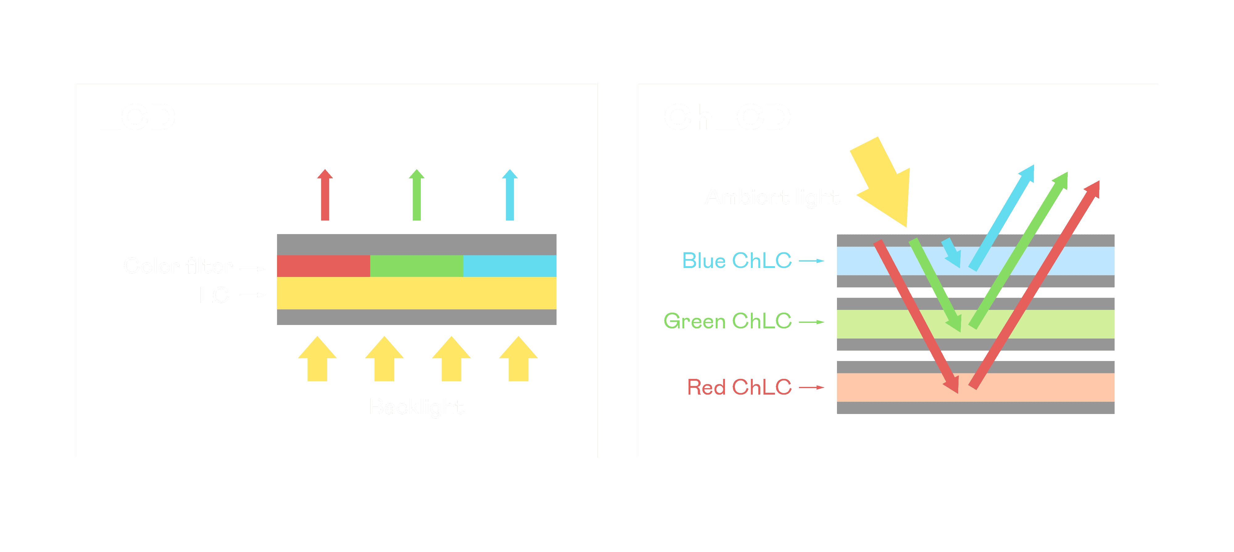 ChLCD 胆固醇液晶就如同纸张一样,,,,透过反射环境光来显示影像,,因此长时间观看不易造成人眼视觉疲劳,,,,可达到护眼效果。。。当处于户外阳光下使用,,,,LCD 影像容易失真而不易观看,,,但胆固醇液晶仍可维持较佳的影像品质。。。