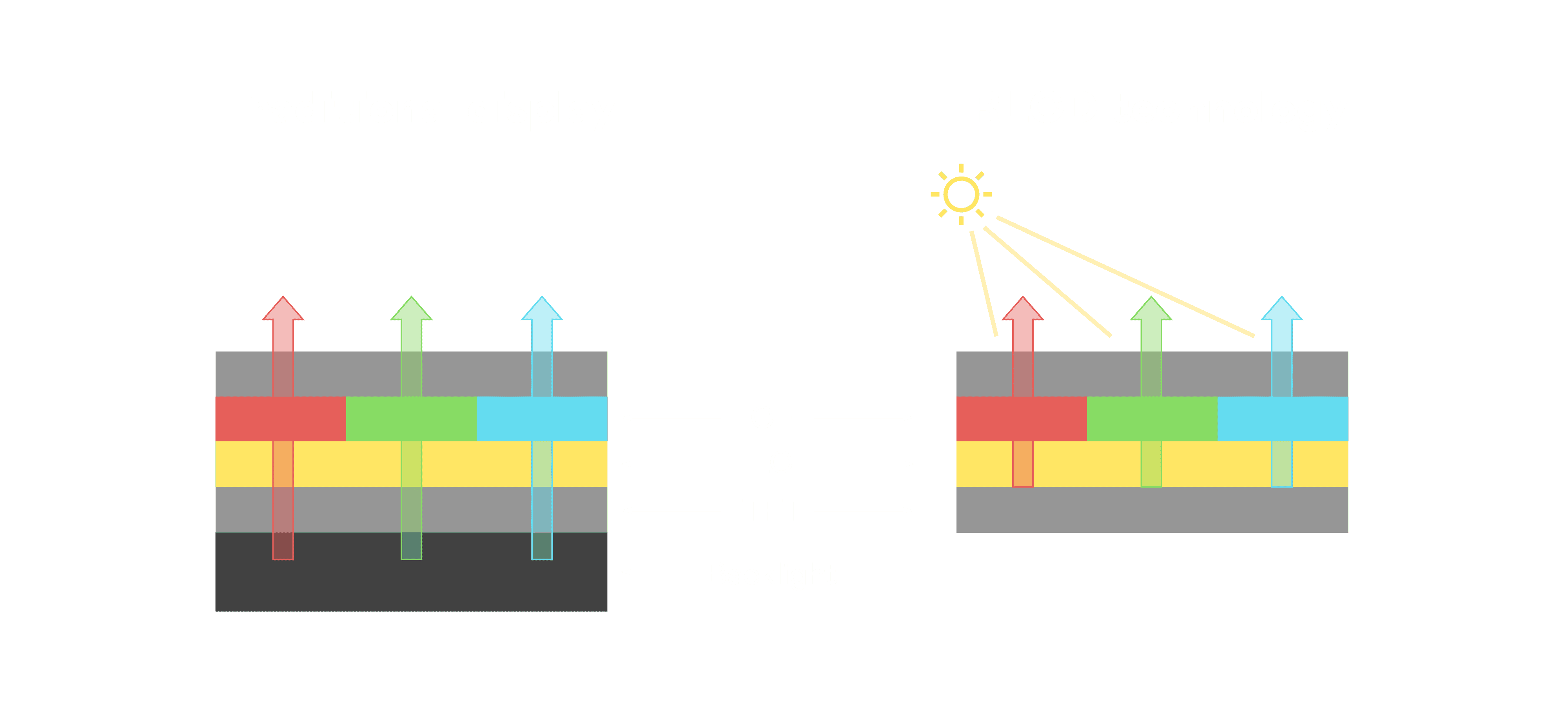 与传统需搭配背光单元的液晶显示相比,,反射式液晶技术不仅更省电、、更轻薄,,,,且即便在艳阳下仍能清晰显示。。。。此外,,,少了背光单元,,,,也大幅降低了 LED 蓝光伤害眼睛的疑虑。。