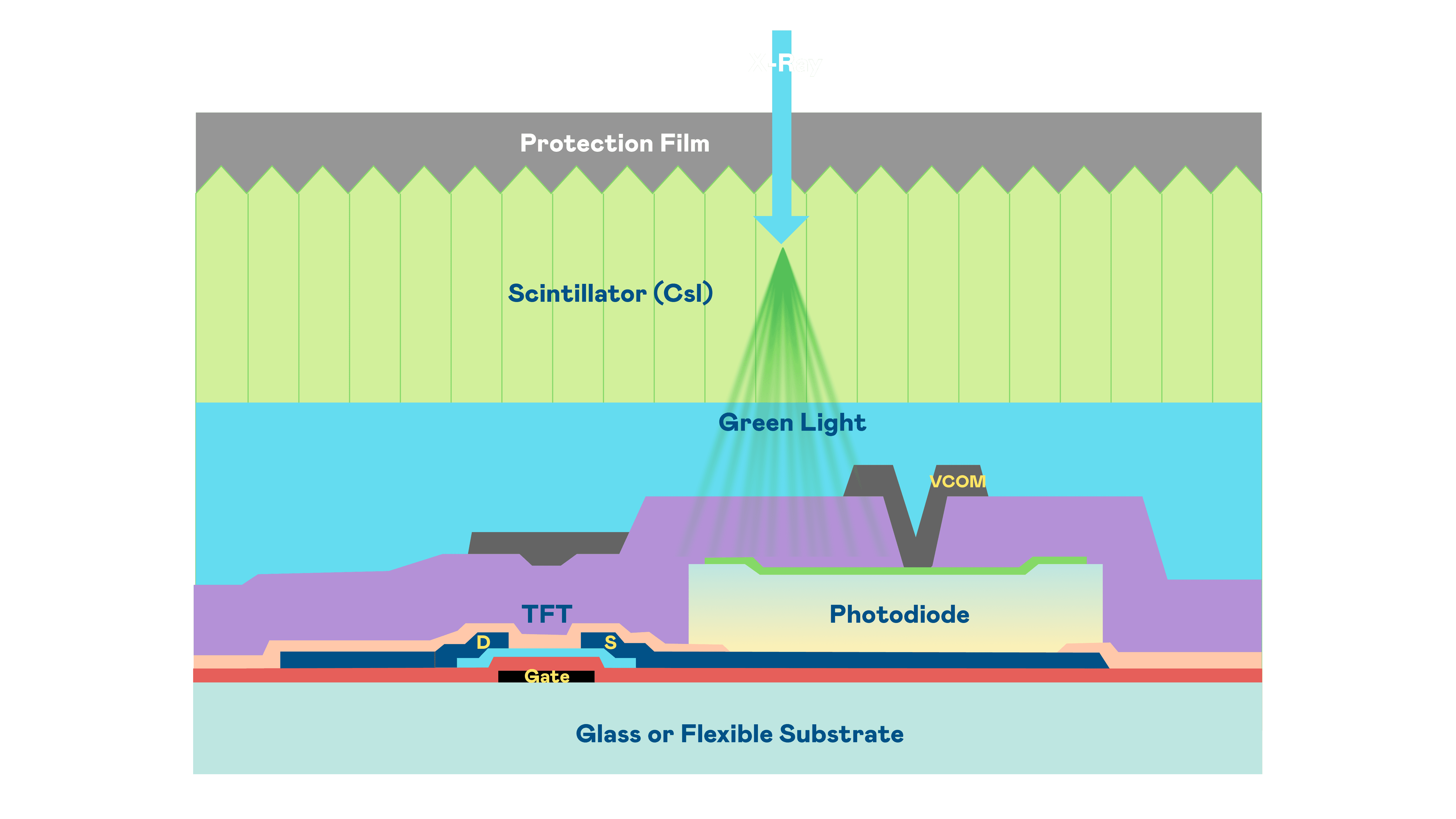 2121非凡的X光影像感测阵列使用薄膜电晶体 (TFT) 作为每个像素的读取开关,,,搭配光电二极体(Photodiode)的光电转换元件,,用以感测X光影像讯号。。